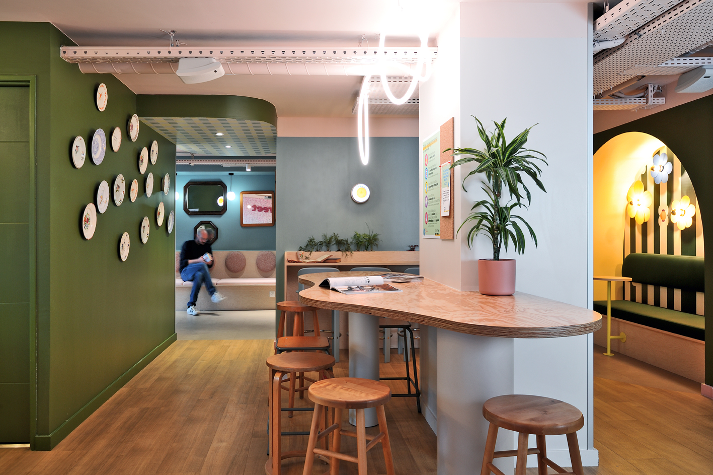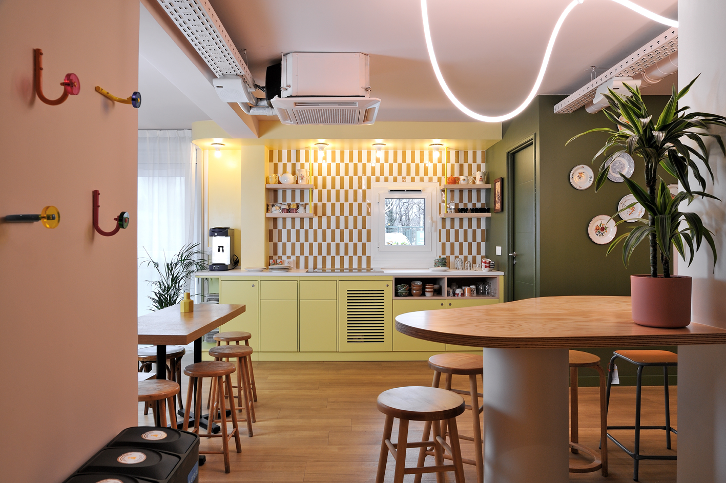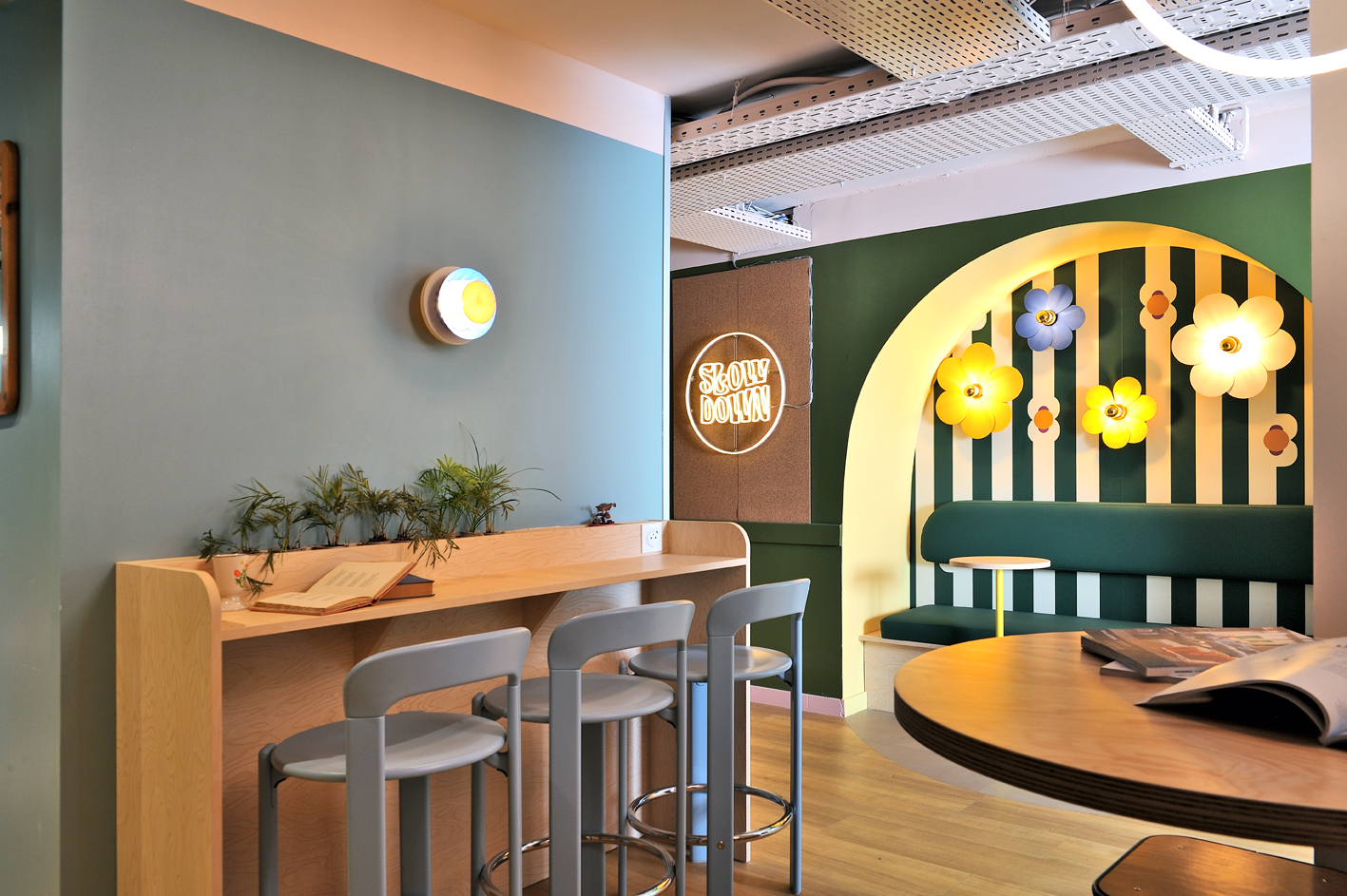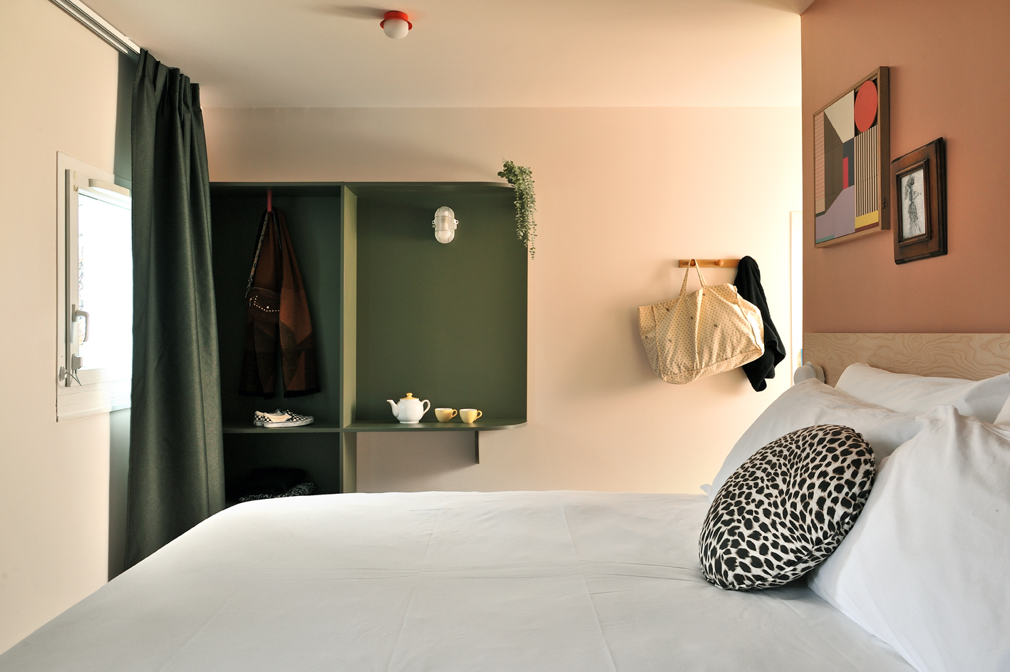 L’équipe a travaillé une décoration décalée , chinée , éco-responsable autour d’un univers coloré , poudré, teinté de tonalité rose et kaki .