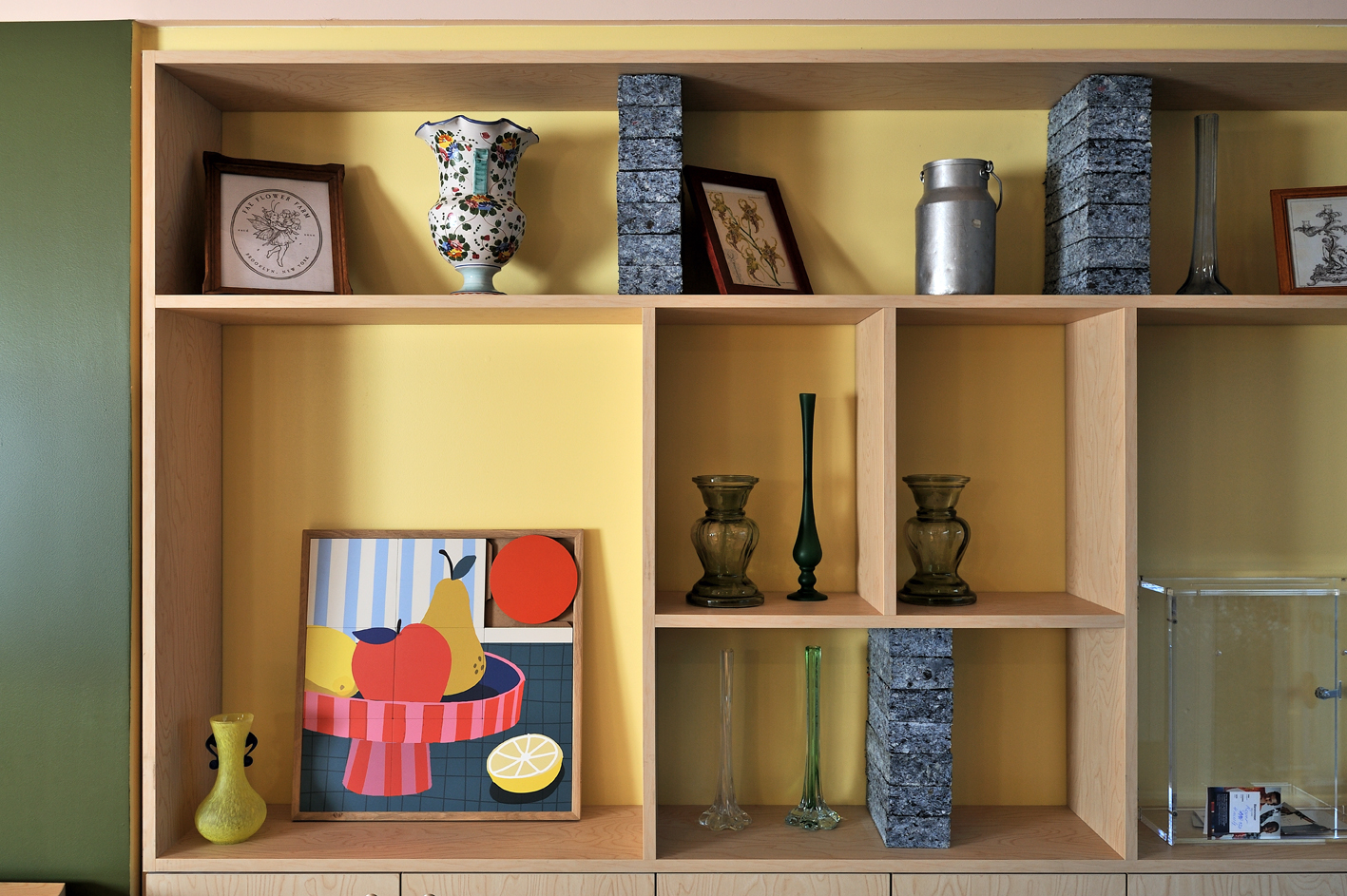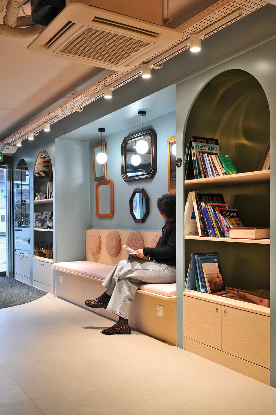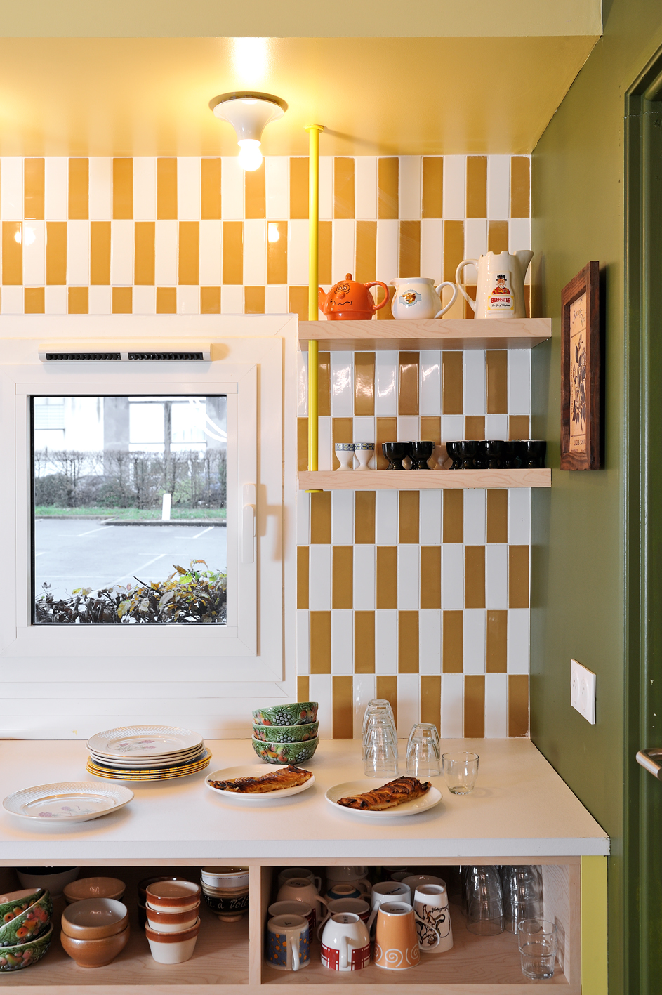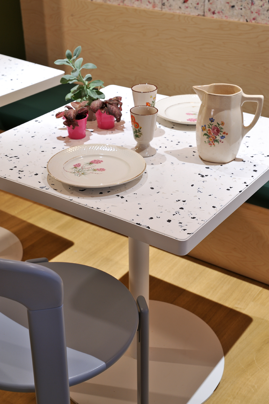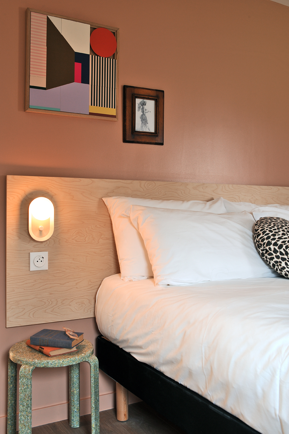L’équipe a travaillé une décoration décalée , chinée , éco-responsable autour d’un univers coloré , poudré, teinté de tonalité rose et kaki .